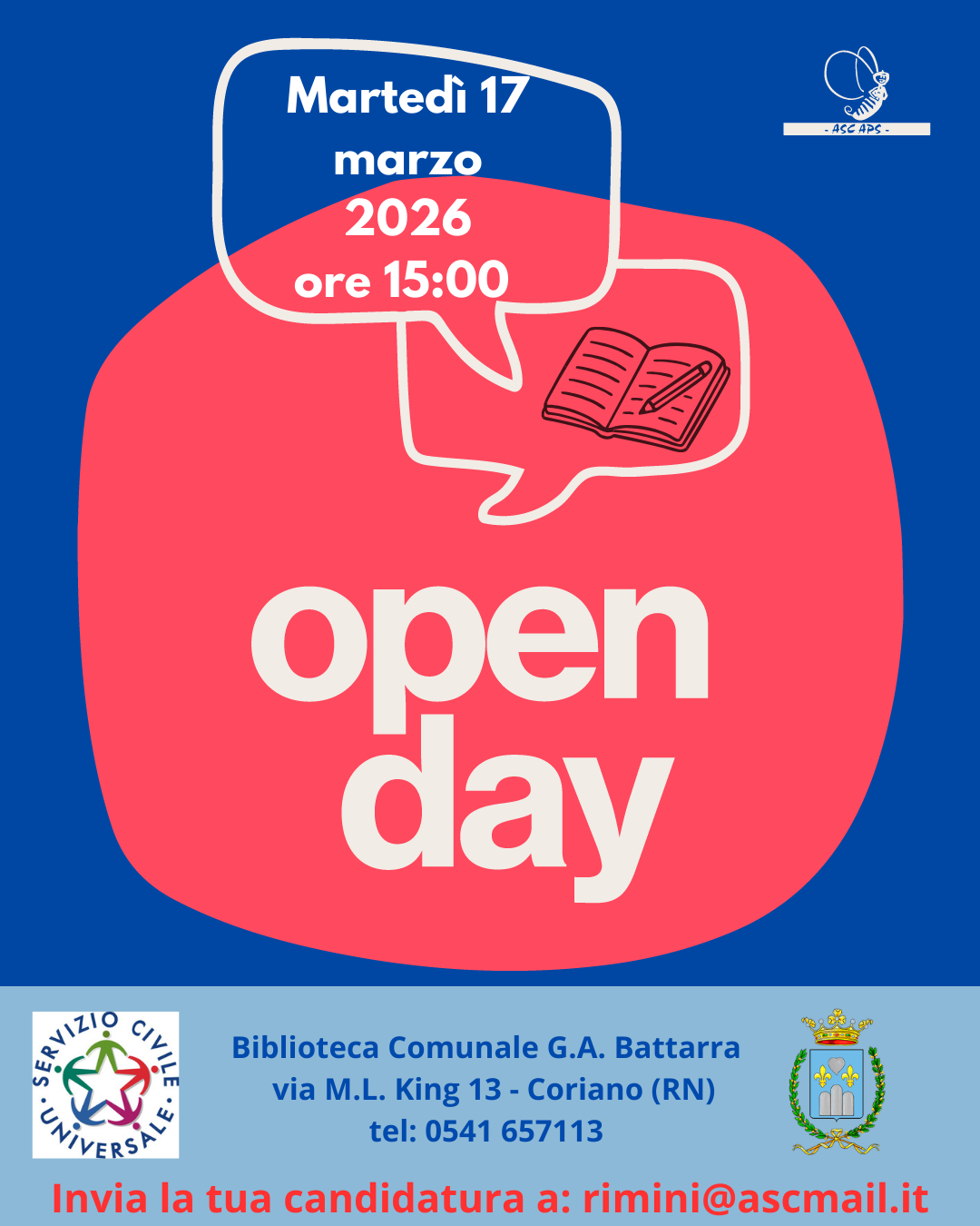 Nel Comune di Coriano il volontario presterà servizio presso la Biblioteca Comunale Battarra via Martin Luther King 13, l'impegno sarà: